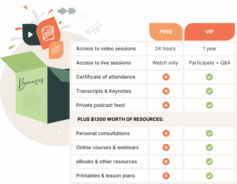One year of access to all 58 presentations, Private access to Live sessions & Q&A with speakers, Access to a private podcast with the sessions to listen on the go, Keynotes and transcripts from the sessions, Certificate of attendance upon request, Plus $1300 worth of bonuses from our speakers, Option to get the first month in the Childhood potential club for just $1